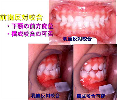 次に、乳歯反対咬合者の中で、永久前歯萌出期(III A )において、自然治癒した者の顎態の特徴を調査し、4歳児における両群の鑑別診断を提示すると、